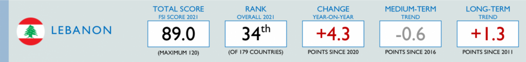 These concurrent political, economic, security and health crises have had devastatingly real impacts on people’s safety, livelihoods, and dignity, especially for the most vulnerable Lebanese and refugee families, as well as jeopardising the country’s stability. This is born out in the Fragile States Index’s data, with Lebanon being ranked fifth in terms of the biggest decline in fragility across several key political, economic and social indicators, which have deteriorated since last year and point to a pattern of long-term decline.