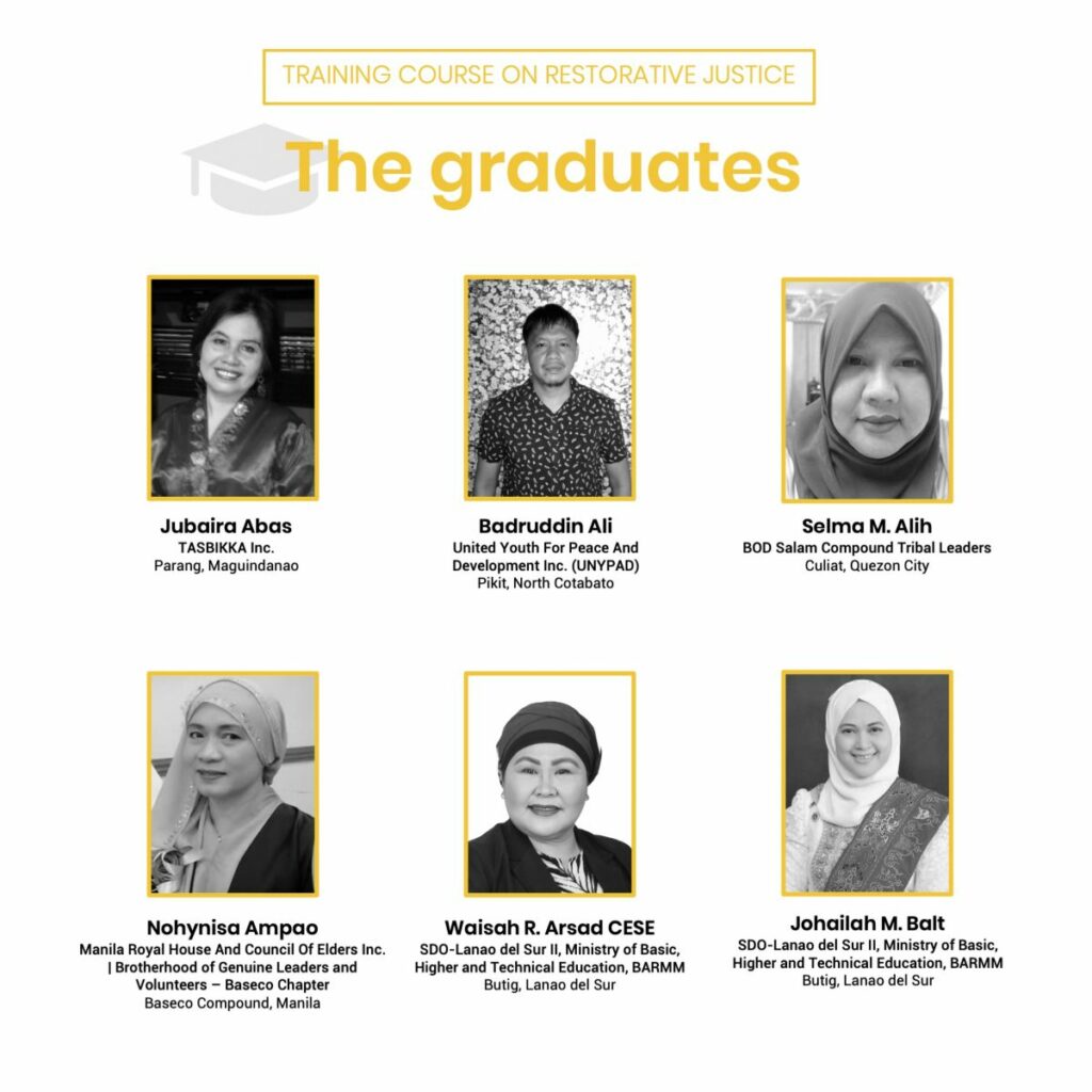 Our first cohort of International Alert Philippines graduates are composed of women leaders, development and peacebuilding professionals, and young civil servants from Lanao del Sur, the SPMS Box in Maguindanao, Zambasulta, and Metro Manila. We look forward to working with them further in implementing the RJ initiatives they designed that are focused on promoting constructive and progressive alternatives to conventional retributive ways of responding to violence and wrongdoing in their communities.